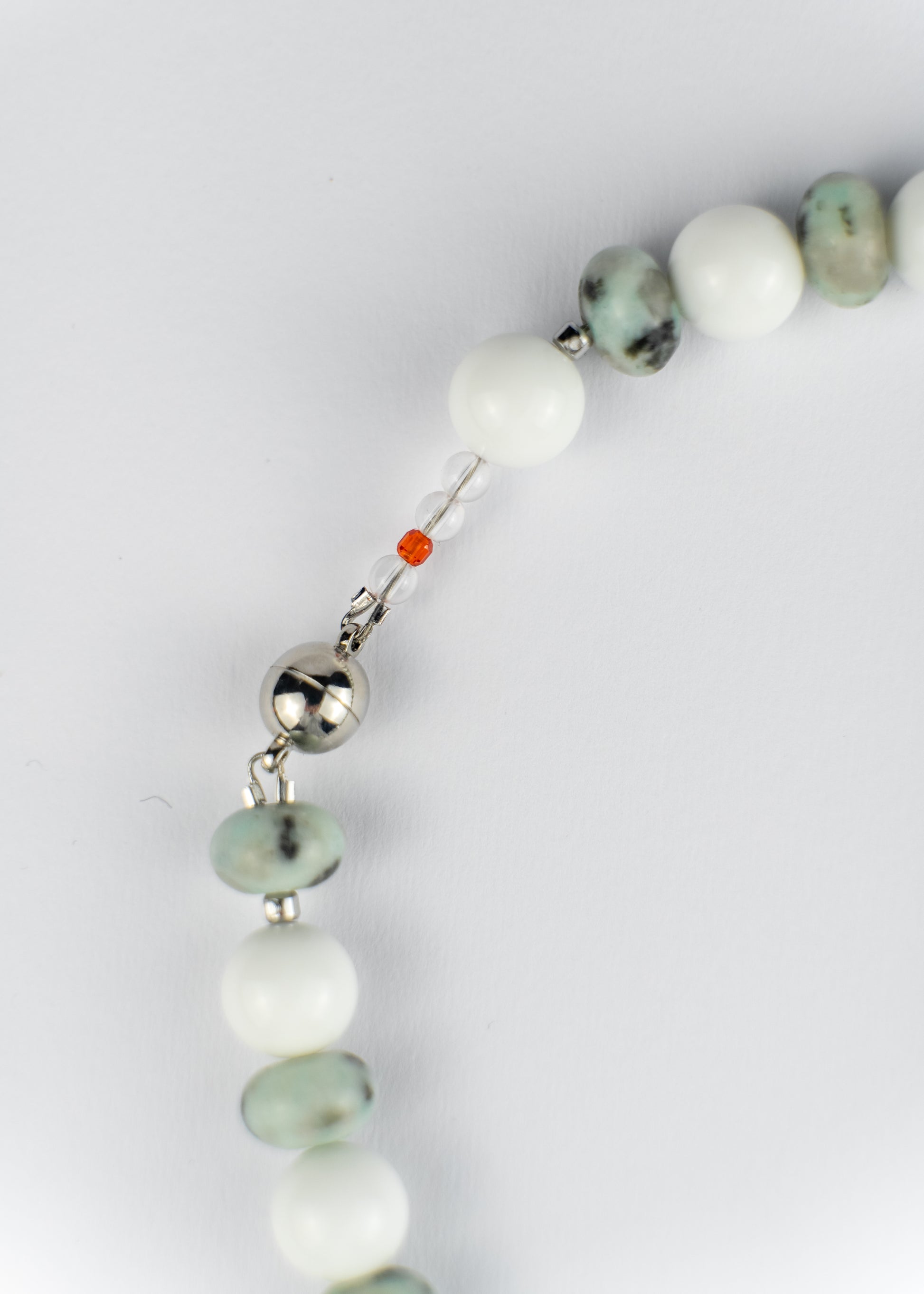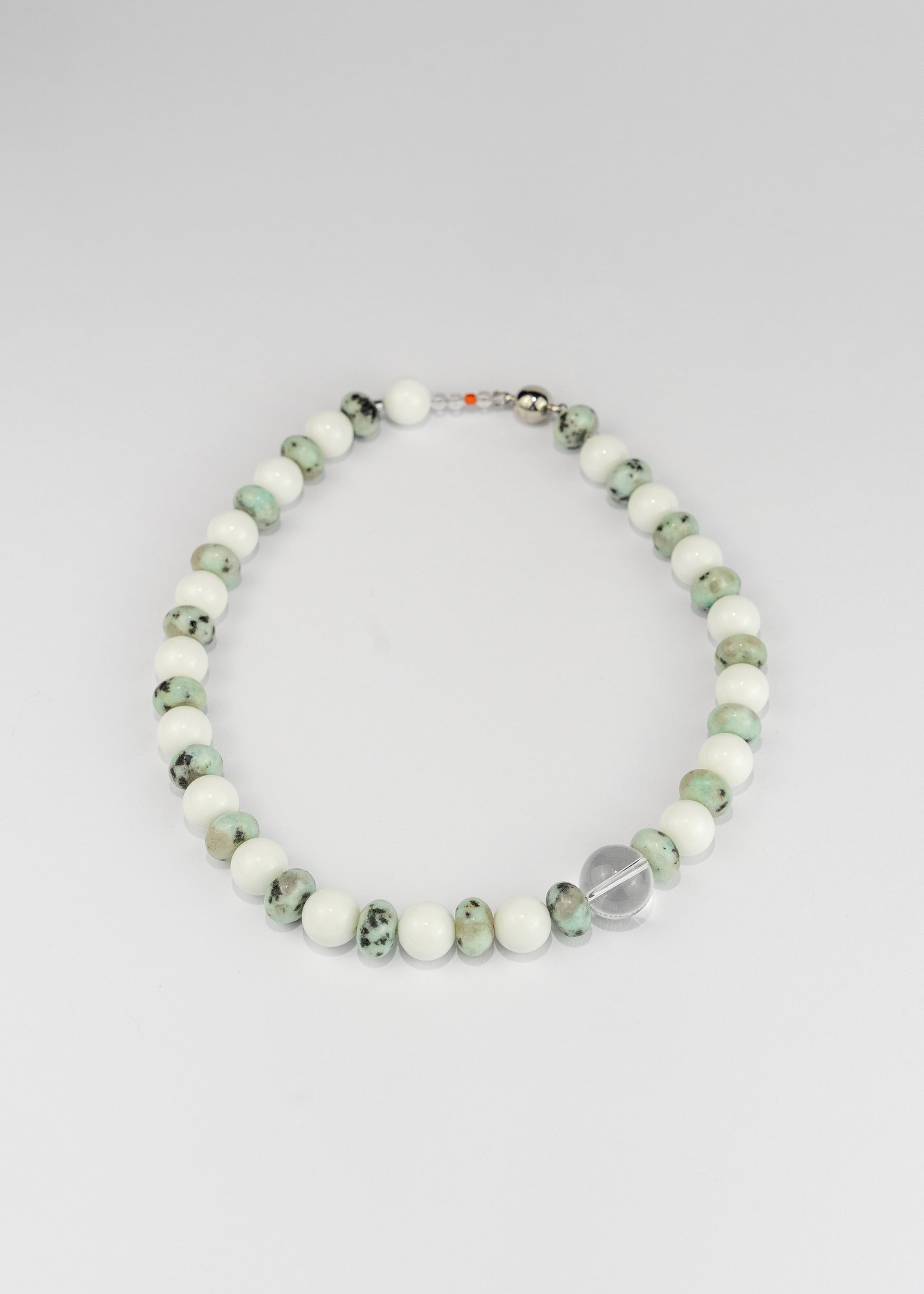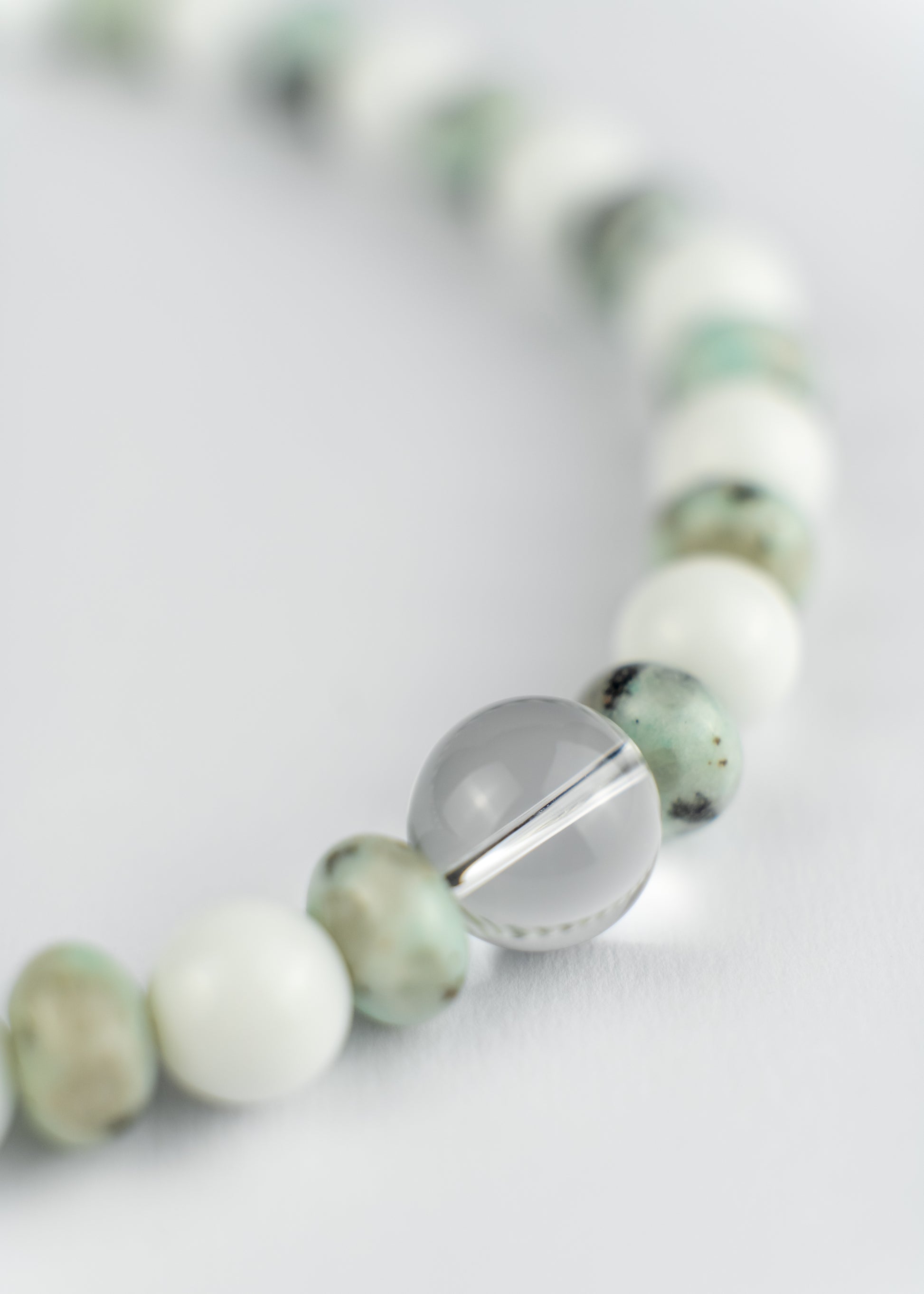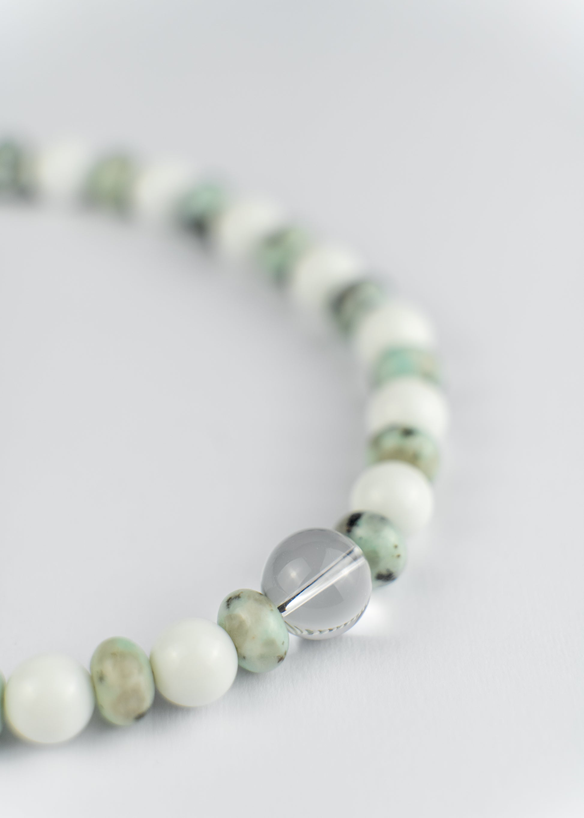 Hand-strung in small batches, this piece plays with pearl textures, cool tones, and soft