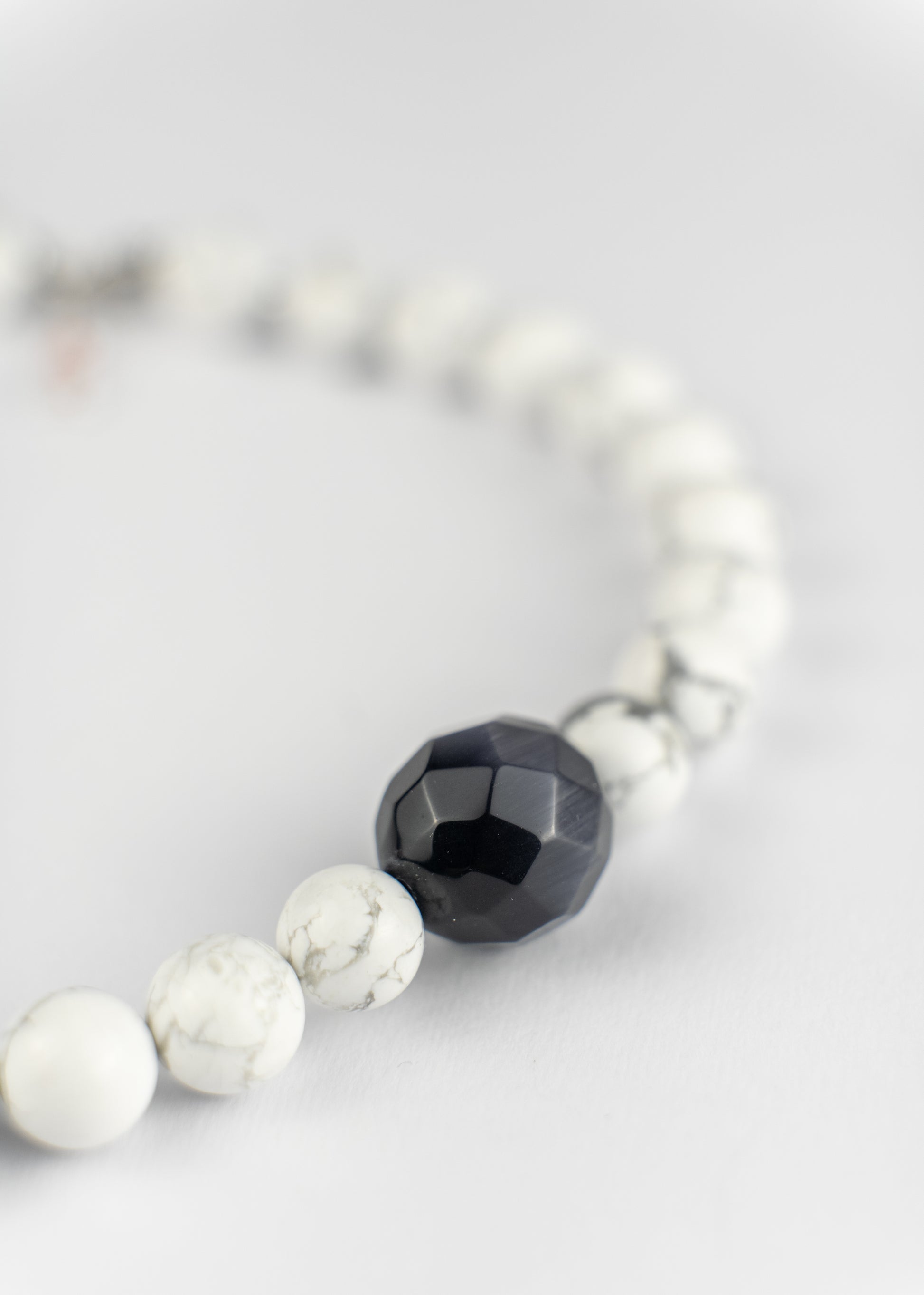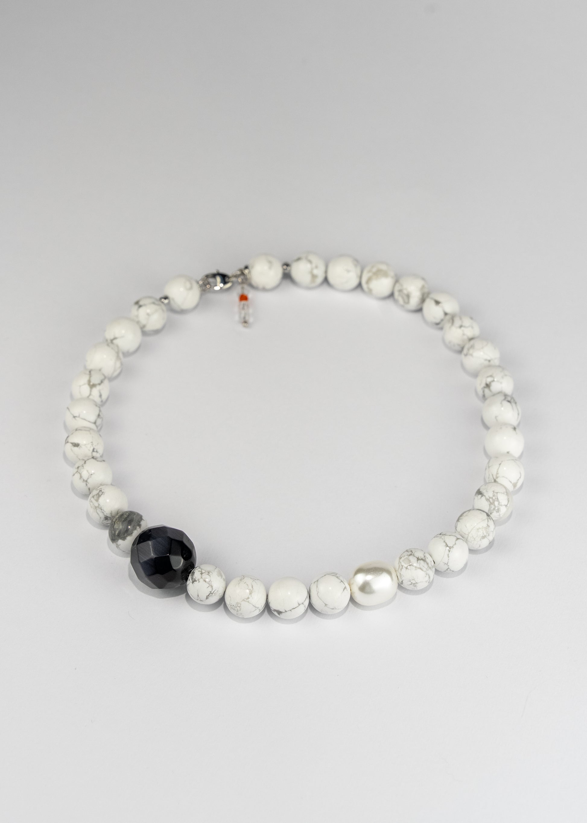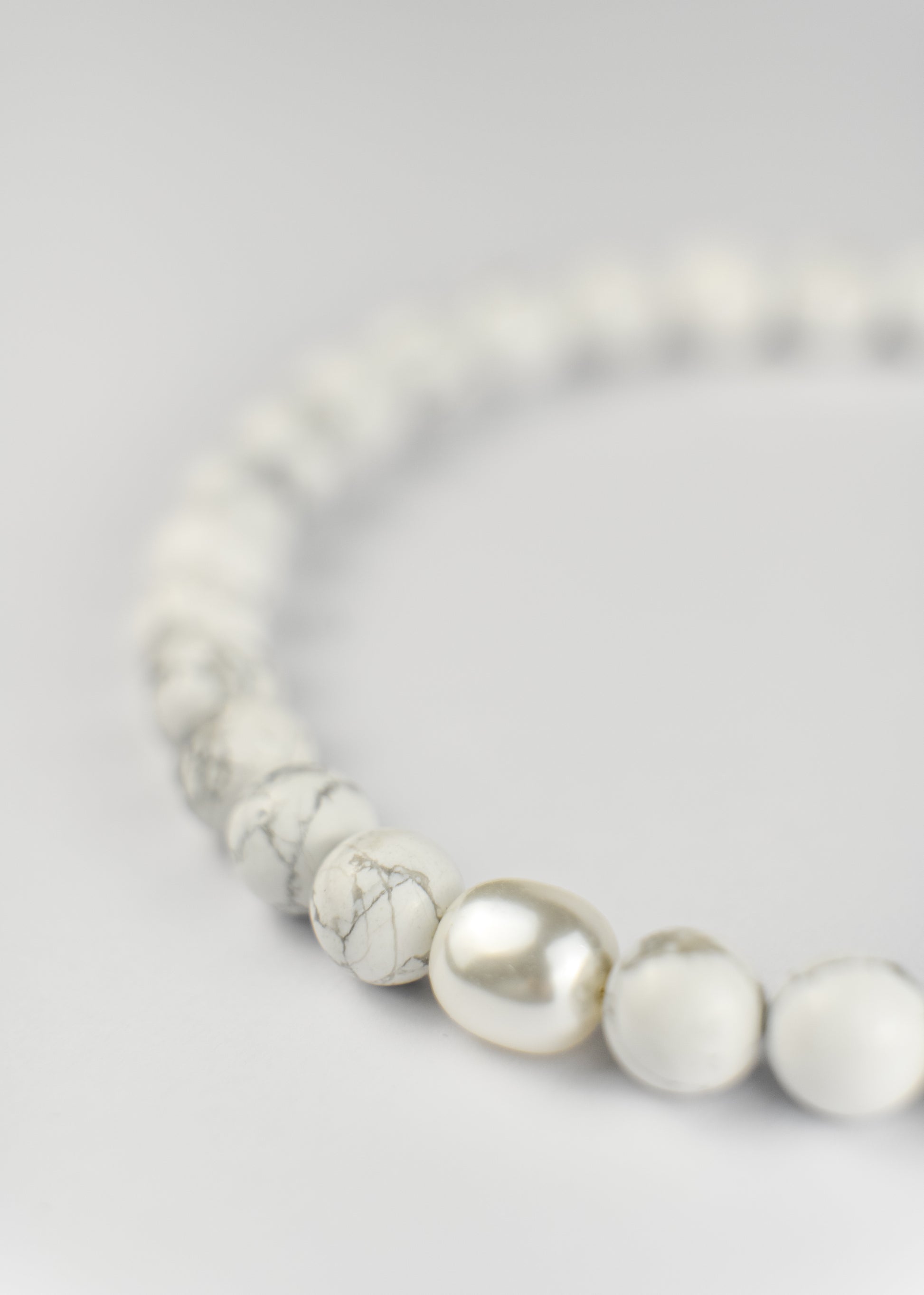 Soft white stones, a quiet shimmer of pearl, and a single dark vintage bead - a calm composition that feels effortlessly elegant.