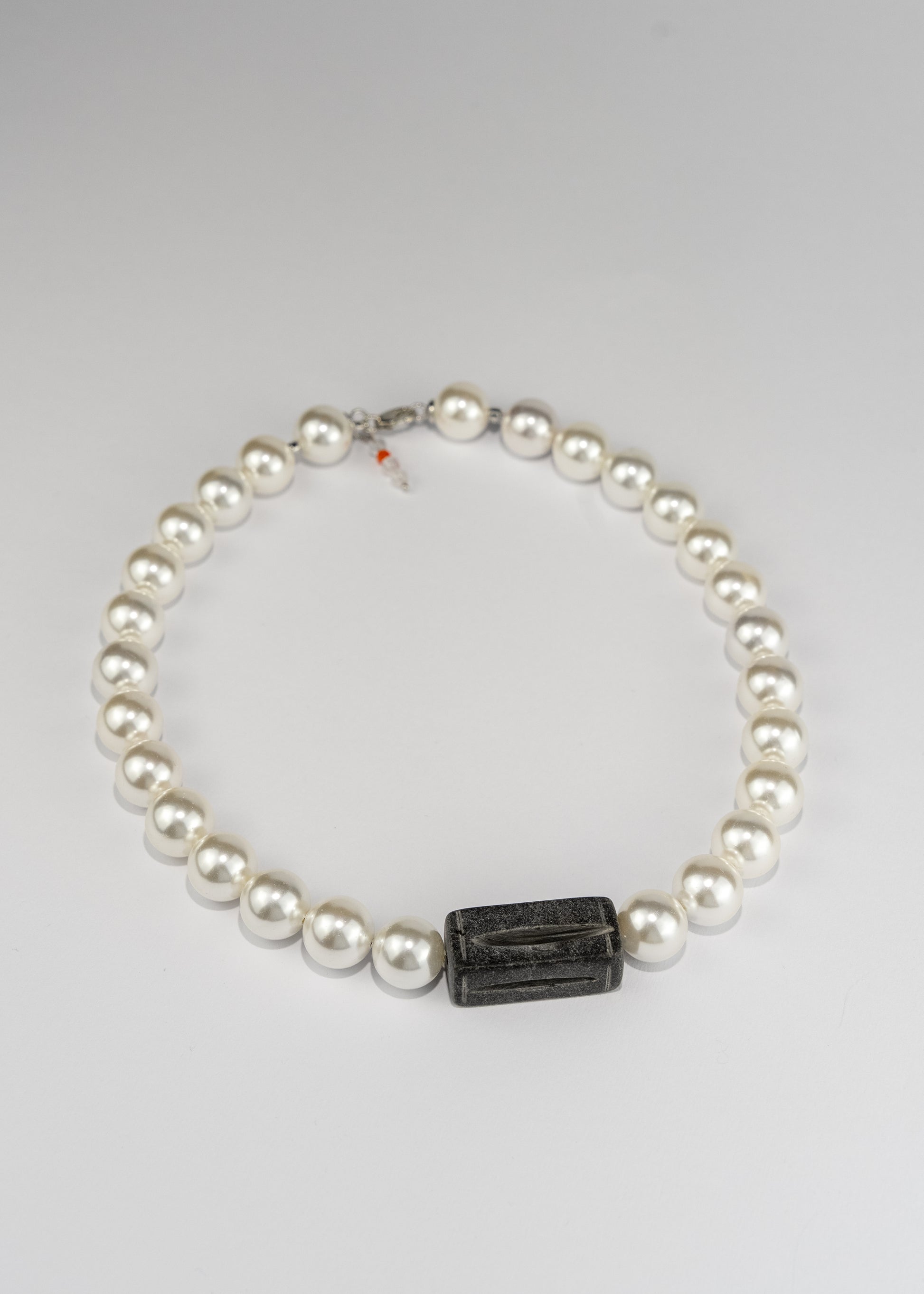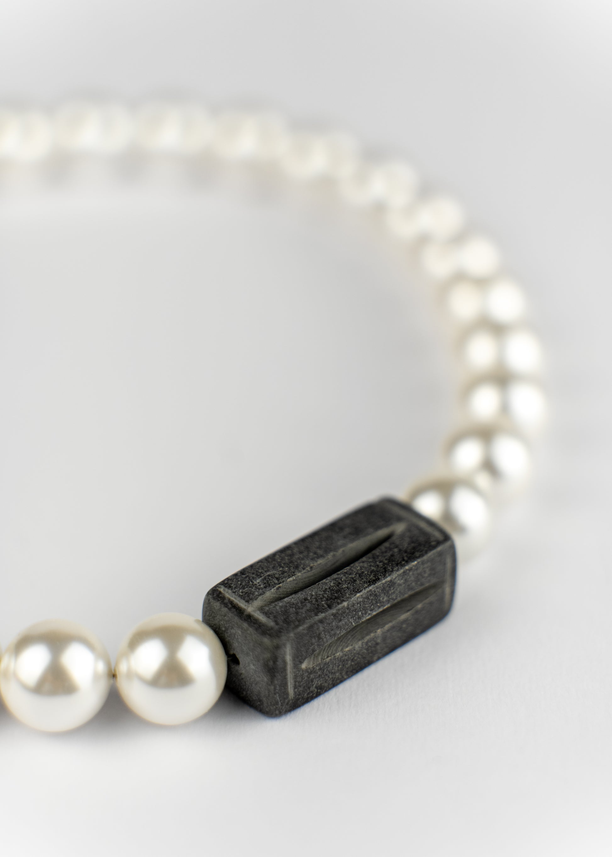 Avoid contact with water, perfume, and harsh chemicals to preserve the finish of the pearls and stone.